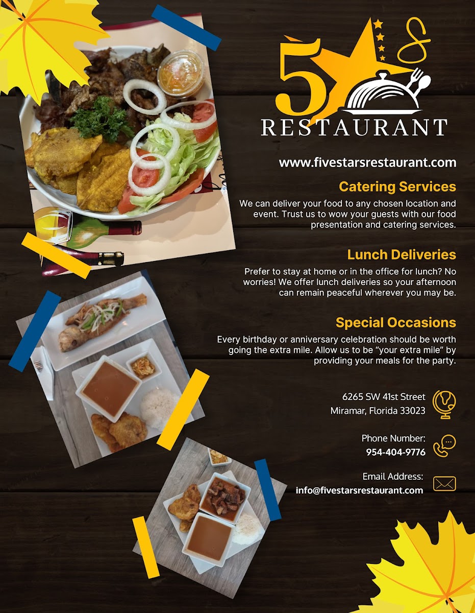 Located in Miramar, FL, Five Stars Caribbean Cuisine is not just a restaurant-it's a destination where guests can enjoy the tastes of the Caribbean in a comfortable, welcoming setting. Whether you're craving traditional flavors or looking to try something new, this restaurant has it all.